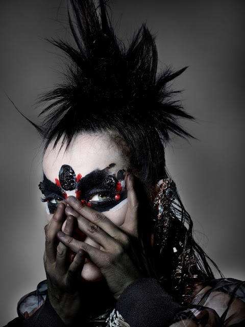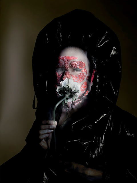 Com stylist de Katy England e make-up de Peter Philips, a cantora e compositora islandesa veste as colecções Primavera-Verão 2016 de House of Harlot, Liya Liu, Comme des Garçons, Ann Demeulemeester e Gareth Pugh com máscaras extraordinárias de Phillips repletas de bordados do legendário François Lesage.